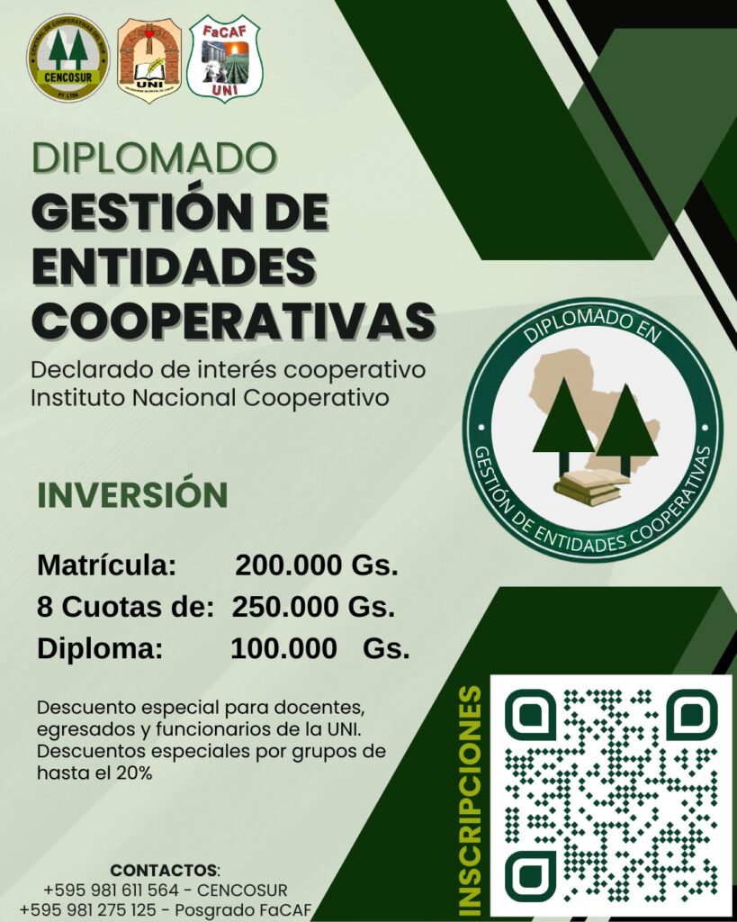 La Central de Cooperativas del Sur y la Facultad de Ciencias Agropecuarias y Forestales de la Universidad Nacional de Itapúa te invitan a participar de la 5.ª edición del Diplomado en Gestión de Entidades Cooperativas.