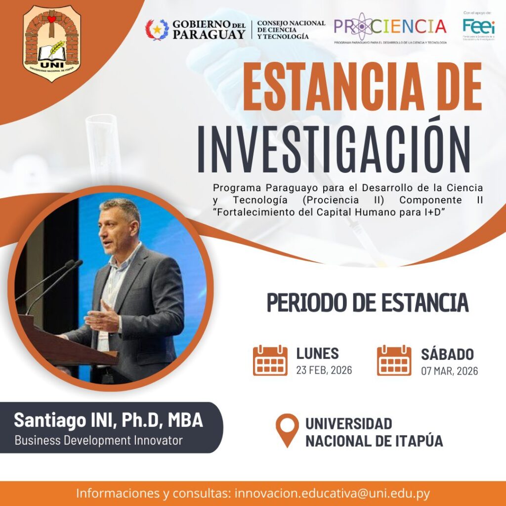 La Universidad Nacional de Itapúa (UNI) recibe al destacado investigador Santiago INI, Ph.D., MBA, en el marco del Programa Paraguayo para el Desarrollo de la Ciencia y Tecnología (CONACYT Paraguay) – PROCIENCIA II, Componente II: Fortalecimiento del Capital Humano para I+D.