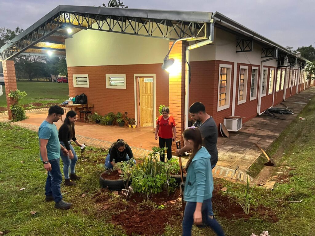 En la jornada de ayer, en el patio de la Universidad Nacional de Itapúa – Filial San Pedro del Paraná, estudiantes de la carrera de Licenciatura en Administración Agropecuaria realizaron la actividad “𝘌𝘴𝘱𝘢𝘤𝘪𝘰𝘴 𝘷𝘦𝘳𝘥𝘦𝘴 𝘴𝘰𝘴𝘵𝘦𝘯𝘪𝘣𝘭𝘦𝘴: 𝘑𝘢𝘳𝘥í𝘯 𝘥𝘦 𝘱𝘭𝘢𝘯𝘵𝘢𝘴 𝘮𝘦𝘥𝘪𝘤𝘪𝘯𝘢𝘭𝘦𝘴 𝘺 𝘢𝘳𝘰𝘮á𝘵𝘪𝘤𝘢𝘴”, con el objetivo de promover la sostenibilidad ambiental mediante la creación de un espacio verde utilizando neumáticos reciclados como contenedores de cultivo.