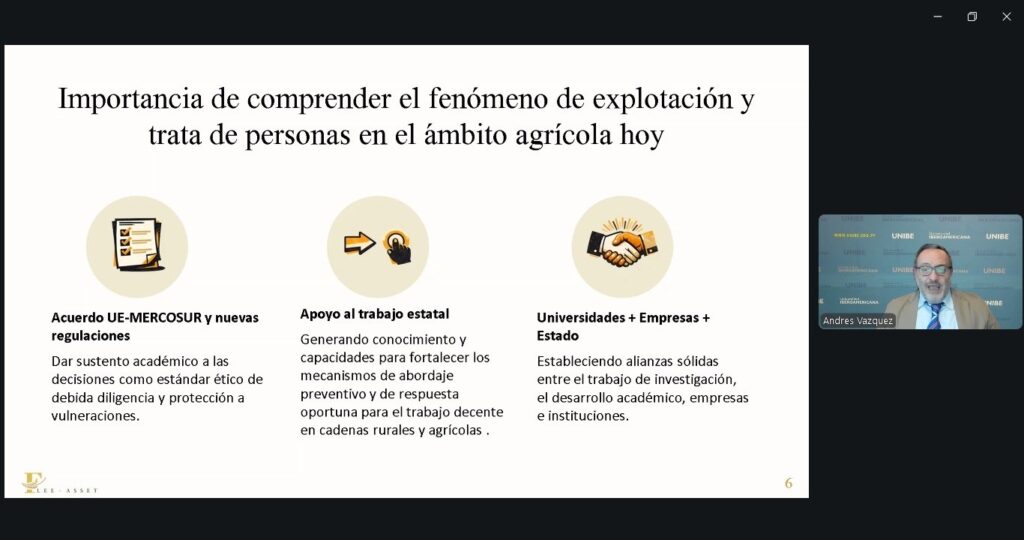 Esta iniciativa forma parte de una serie de acciones de formación impulsadas por universidades que integran un consorcio académico internacional, con el apoyo de la comunidad europea, orientadas a fortalecer capacidades para la prevención, detección y abordaje de la explotación laboral en el sector agrícola.