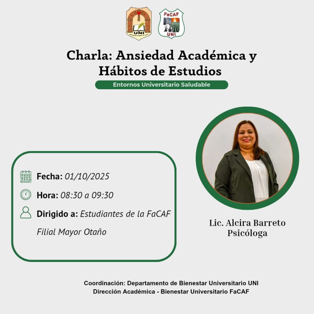 La Facultad de Ciencias Agropecuarias y Forestales – UNI, a través del Departamento de Bienestar Universitario y la Dirección Académica – Bienestar Universitario, invita a todos los estudiantes de la FaCAF Filial Mayor Otaño y Natalio a participar de esta valiosa charla enmarcada en el programa “Entornos Universitarios Saludables”.