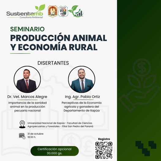 La Facultad de Ciencias Agropecuarias y Forestales, en conjunto con Consultoría Ambiental Sustentamb, invita cordialmente a participar del seminario “ 𝘗𝘳𝘰𝘥𝘶𝘤𝘤𝘪ó𝘯 𝘈𝘯𝘪𝘮𝘢𝘭 𝘺 𝘌𝘤𝘰𝘯𝘰𝘮í𝘢 𝘙𝘶𝘳𝘢𝘭 ”