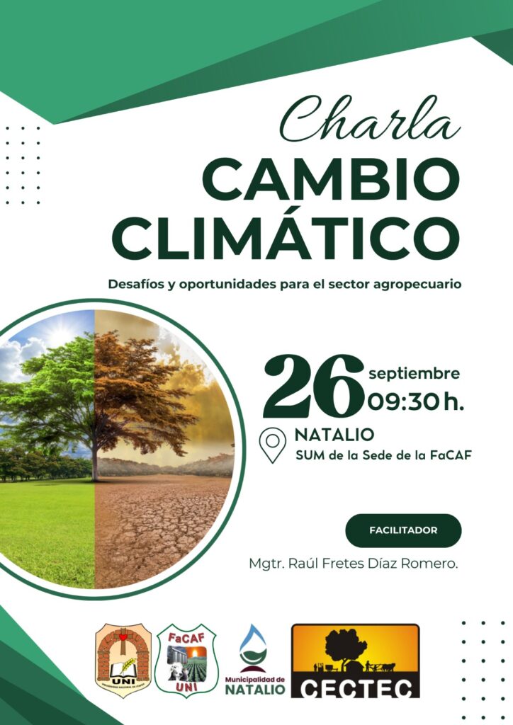 🌍✨La Facultad de Ciencias Agropecuarias y Forestales (FaCAF-UNI), en conjunto con la Municipalidad de Natalio y el CECTEC, tienen el agrado de invitar a toda la comunidad a participar de la Charla sobre Cambio Climático: Desafíos y oportunidades para el sector agropecuario.
