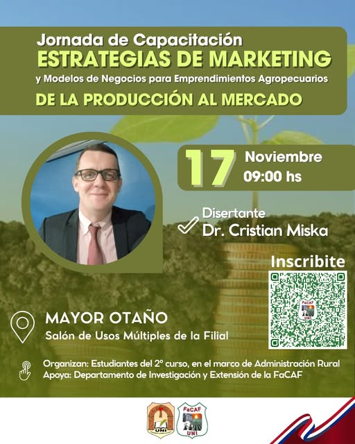La Facultad de Ciencias Agropecuarias y Forestales de la Universidad Nacional de Itapúa Filial Mayor Otaño, invita a la Jornada de Capacitación: 𝘌𝘴𝘵𝘳𝘢𝘵𝘦𝘨𝘪𝘢𝘴 𝘥𝘦 𝘔𝘢𝘳𝘬𝘦𝘵𝘪𝘯𝘨 𝘺 𝘔𝘰𝘥𝘦𝘭𝘰𝘴 𝘥𝘦 𝘕𝘦𝘨𝘰𝘤𝘪𝘰𝘴 𝘱𝘢𝘳𝘢 𝘌𝘮𝘱𝘳𝘦𝘯𝘥𝘪𝘮𝘪𝘦𝘯𝘵𝘰𝘴 𝘈𝘨𝘳𝘰𝘱𝘦𝘤𝘶𝘢𝘳𝘪𝘰𝘴.